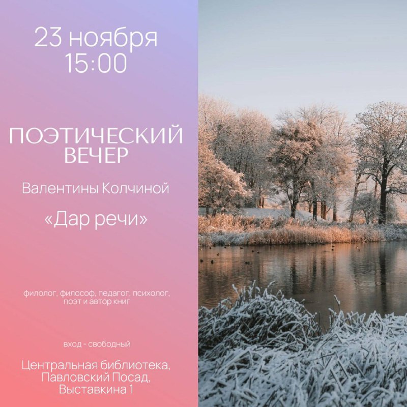 Дорогие читатели! С радостью приглашаем вас на Праздничный концерт, посвященный Дню матери, который пройдет в нашей библиотеке! Этот особенный праздник— прекрасная возможность выразить свою любовь и благодарность самым дорогим людям в нашей жизни. Дата: 27.11.2025Время: 14:00Место: Центральная библиотека г. Павловский Посад В программе концерта вас ждут: Приходите вместе с семьями, чтобы разделить радость этого дня […]